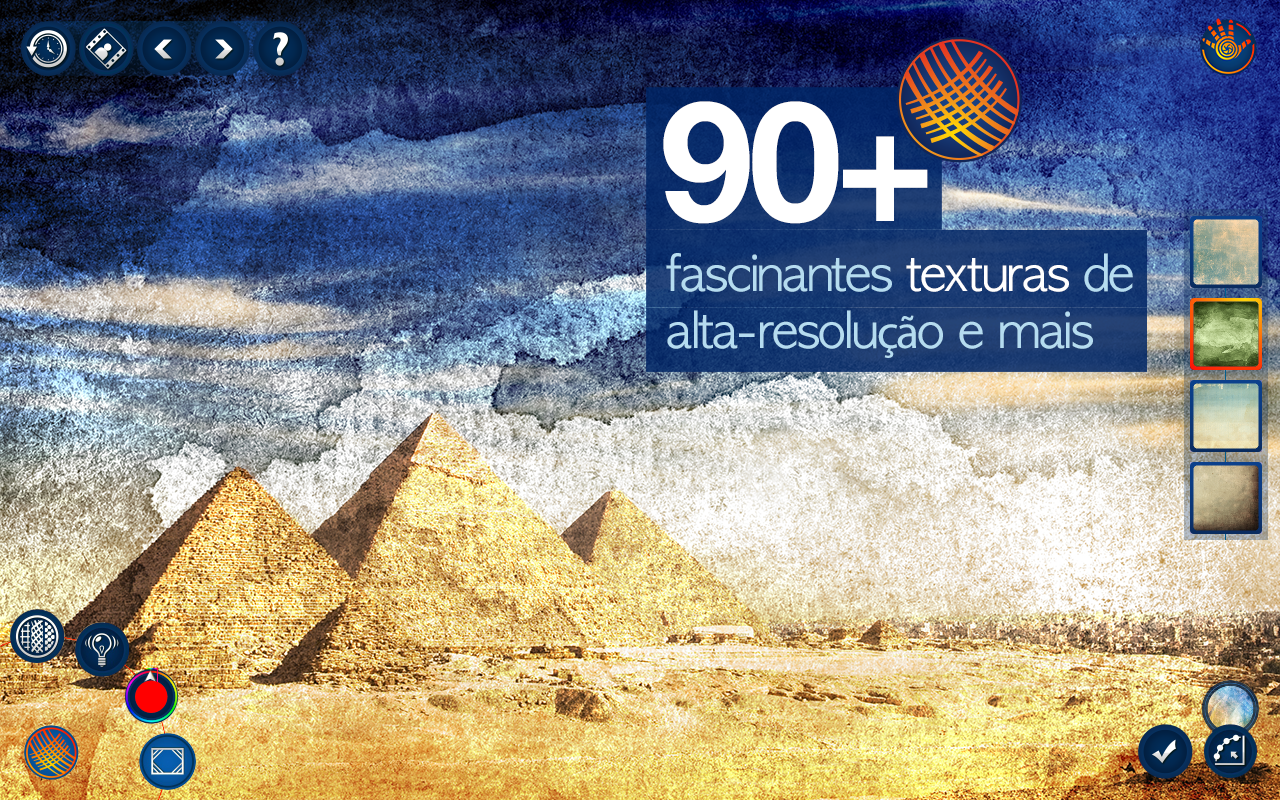 Crie você mesmo o ambiente das suas histórias das fotos com o pacote de magníficas texturas (mais de 90) do Handy Photo. Faça a aplicação para melhorar suas fotos e torná-las verdadeiramente populares. Você poderá selecionar os seguintes grupos de texturas: “Cloth”, “Clouds”, “Frost and Ice”, “Grunge”, “Paper”, “Water”, “Wood”.