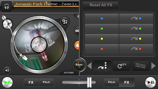 Graças à auto mistura, edjing faz todas as transições para você. Você pode personalizar as transições que você quer e programar a sincronização automática de BPM (Auto Opção Sync BPM) para que as batidas de sua música sempre coincidam.